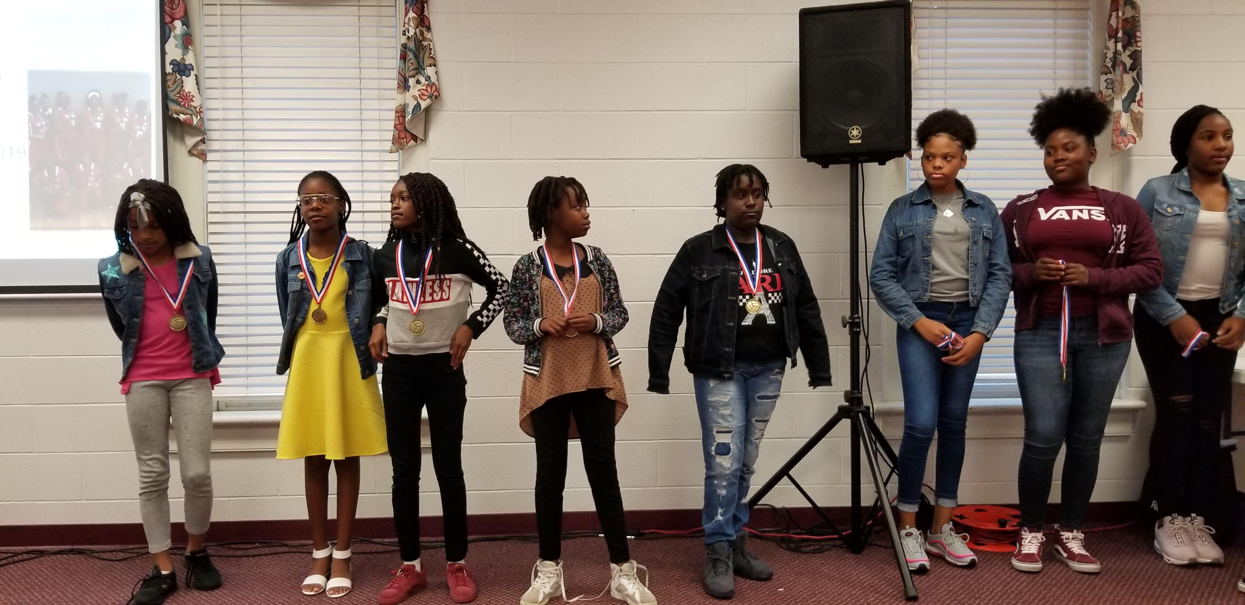 Elementary students proudly wearing academic achievement medals. Since integrating Fabric Futures principles into their school environment, teachers have noted stronger confidence, improved engagement, and higher participation.