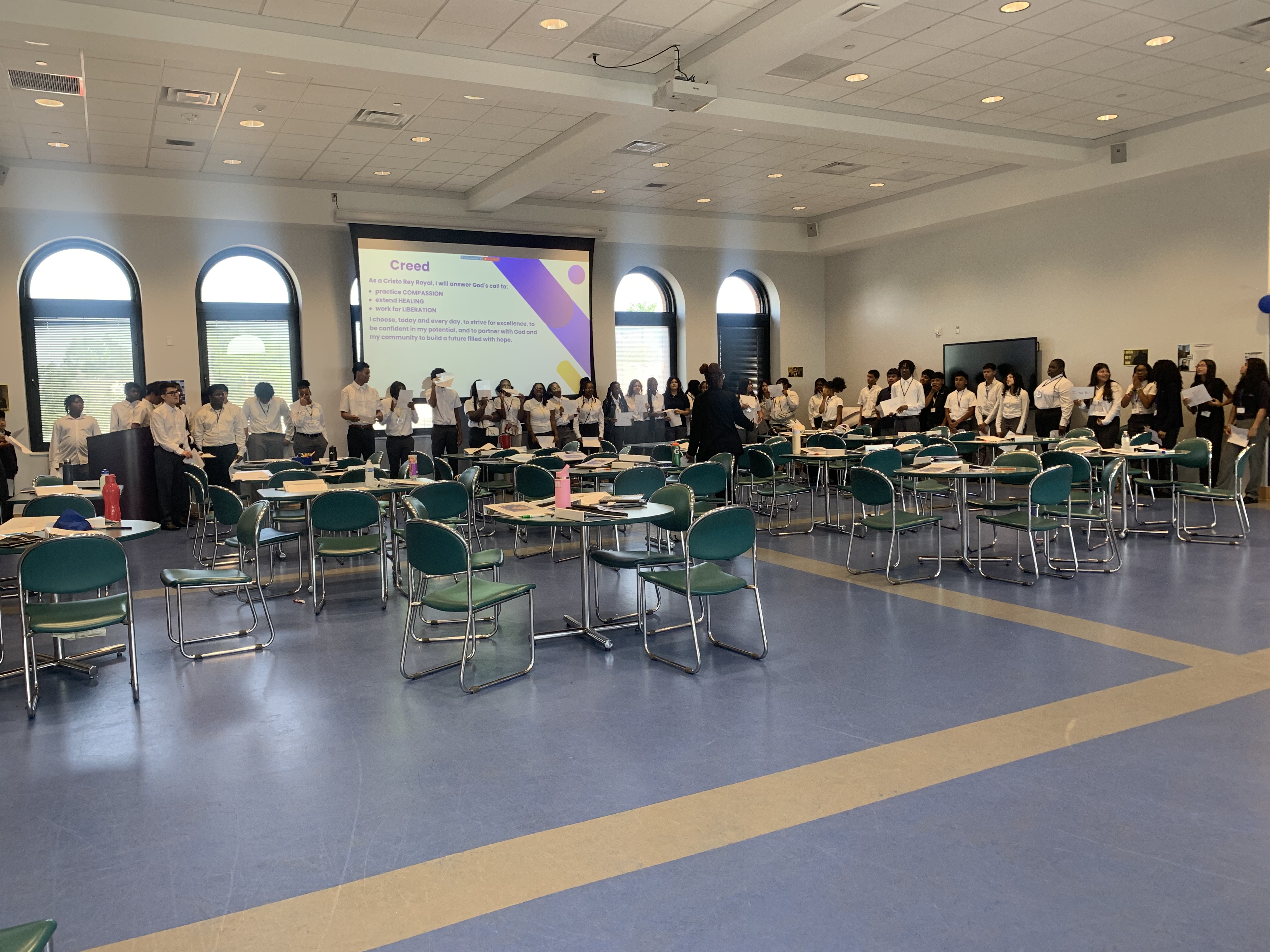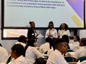 A high school group of over 75 students learning public speaking, leadership, and the power of their voice during a Fabric Futures interactive session.