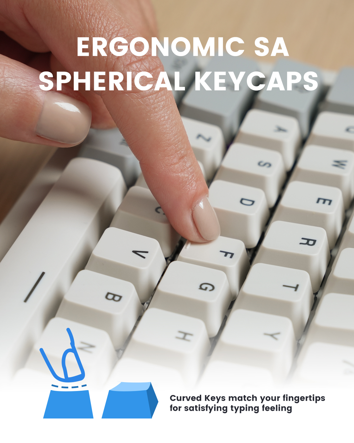 Key Design: Curved keycaps with flatter top and contoured edges