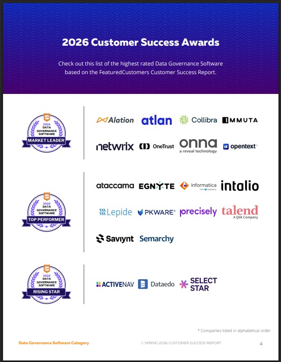 COOPER CITY, FL, UNITED STATES, April 14, 2026 /EINPresswire.com/ -- Today FeaturedCustomers published the Winter 2026 Data Governance Software Customer Success Report to give prospects better insight on which Data Governance Software would work best for their business according to real customer references.The highest rated vendors according to the Winter 2026 Data Governance Software Customer Success Report are: